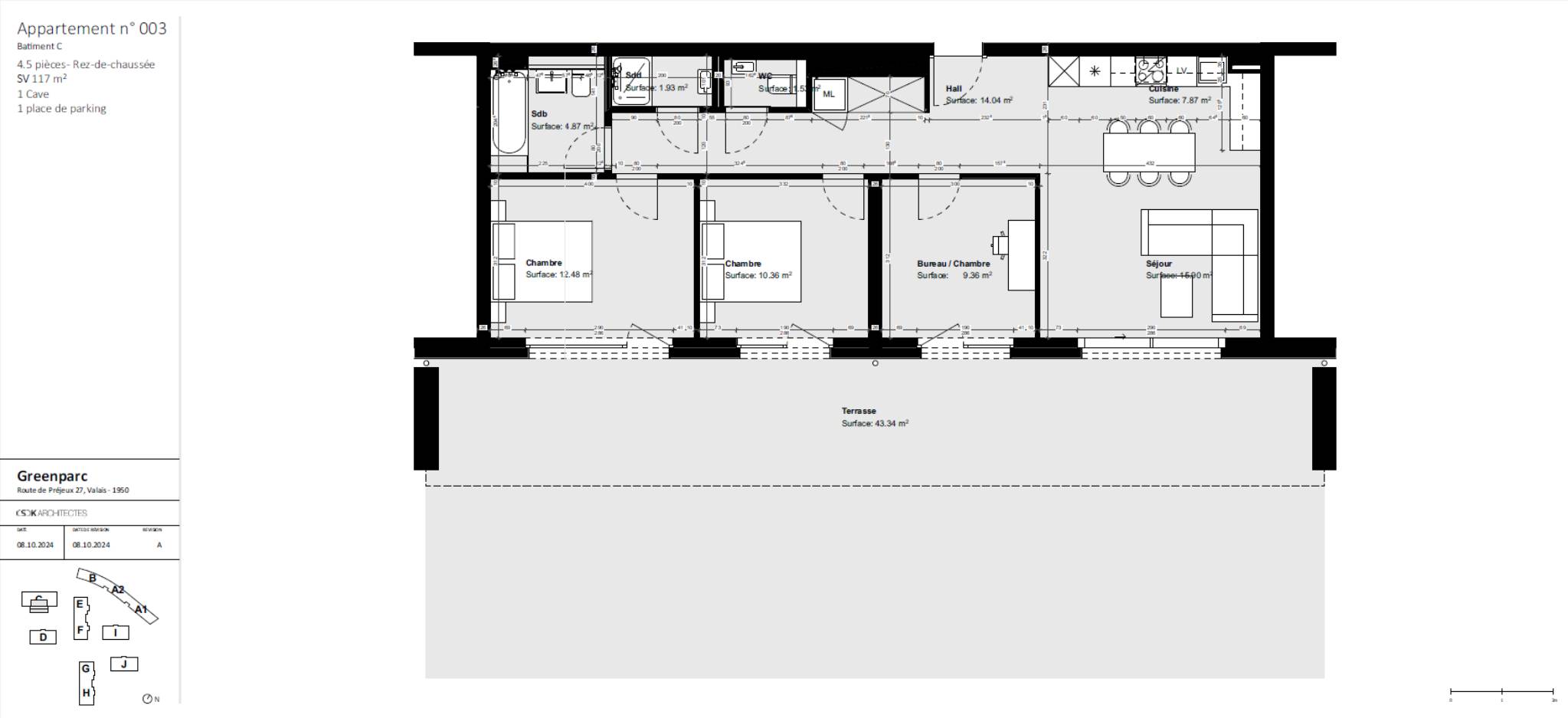 ***Le lot C-003 est un appartement de 4.5 pces de 95 m2 au rez-de-chaussée, avec une terrasse de 44 m2 et un jardin de 67 m2, distribué comme suit :. hall d’entrée. une cuisine ouverte sur le séjour donnant accès à la terrasse . une chambre à coucher avec salle de bain attenante et un accès à la terrasse . un espace pour la colonne de lavage et WC aussi dans la salle de bain attenante. deux chambres donnant sur la terrasse. un WC invité. une salle de douche